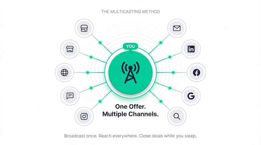 Instead of knocking on one door at a time, you broadcast your offer across multiple channels at the same time.